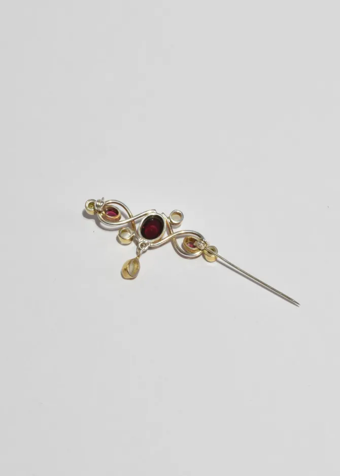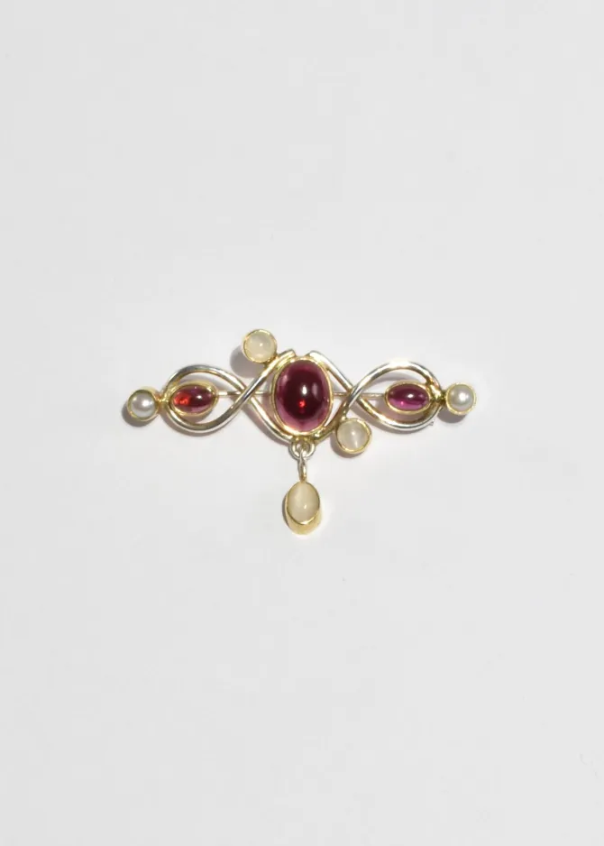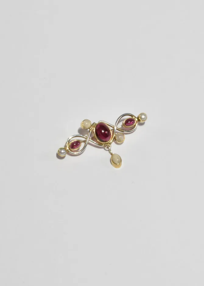 Vintage brooch featuring bezel-set pink tourmalines, pearls, and a delicate moonstone drop detail. Art Nouveau-inspired swirling metalwork. Pin-back closure.