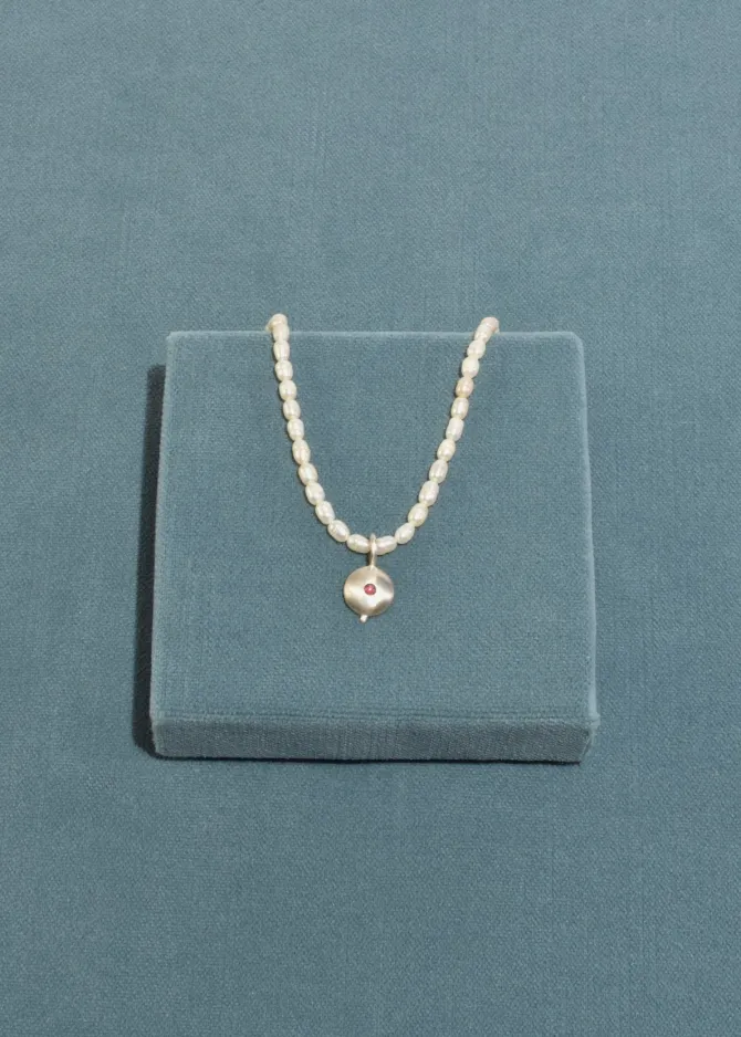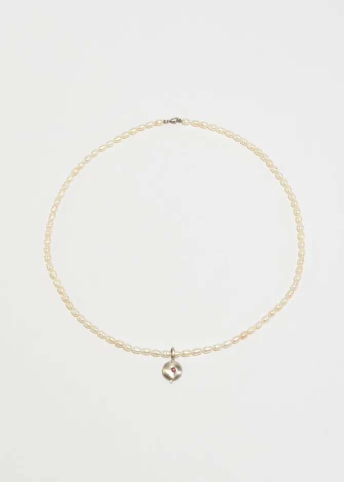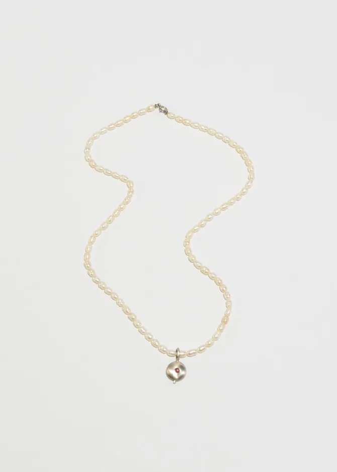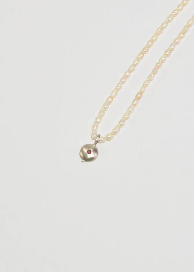 Beautiful, vintage petite freshwater pearl necklace with a round sterling pendant set with a pink tourmaline stone, clasp closure. Stamped,925.