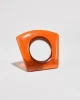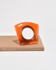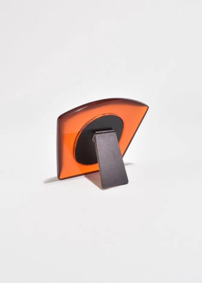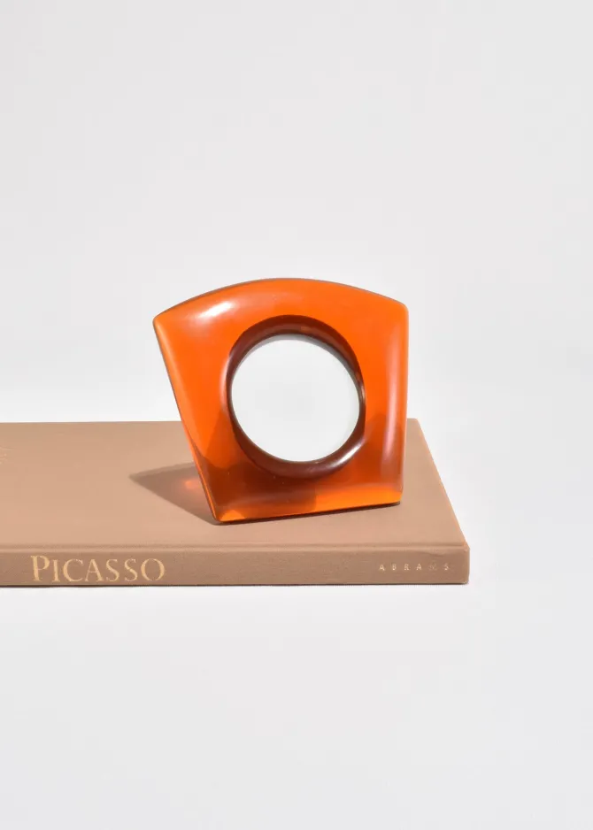 Sculptural picture frame in warm amber lucite. The material glows subtly when it catches the light, adding depth to its rich color. Fits a 3 x 3″ photo. Ca. 1990s.