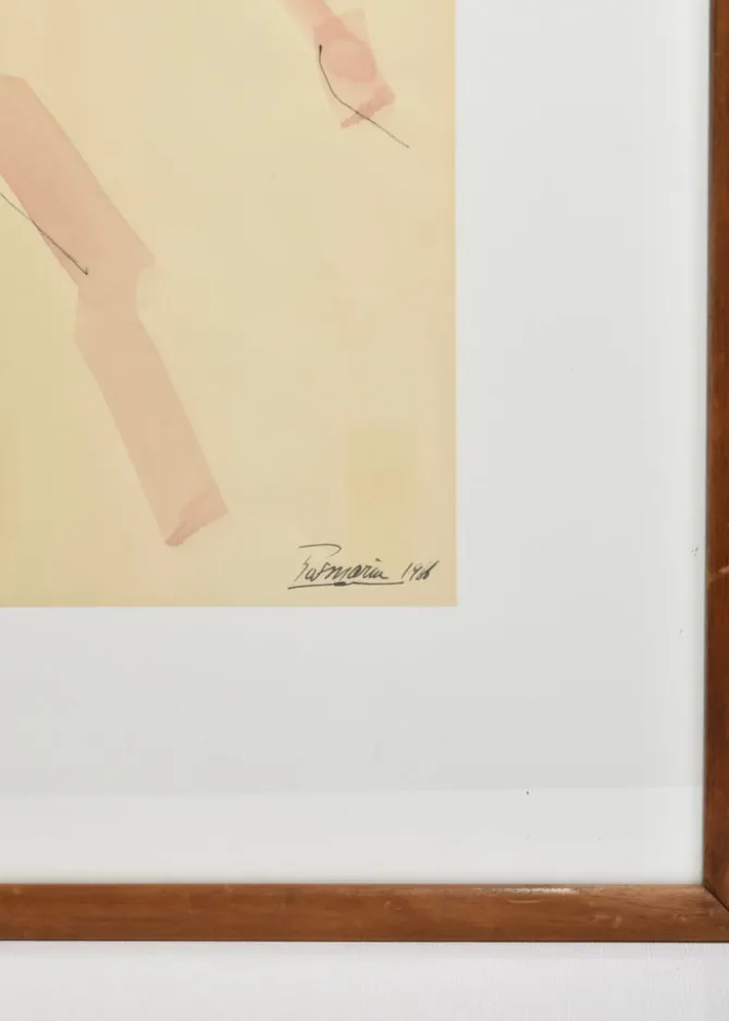 Ink and watercolor on paper depicting a standing figure in motion, rendered with gestural washes of sienna and fluid line. Signed and dated 1988 in the lower right corner. Framed under glass in wood.