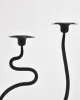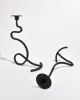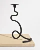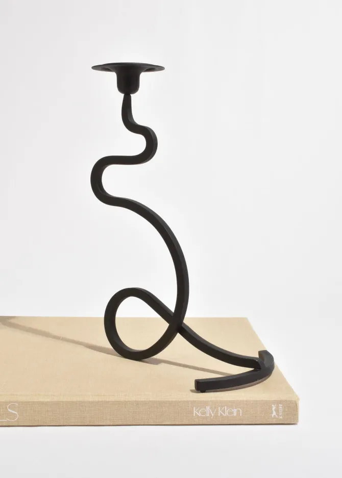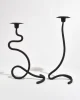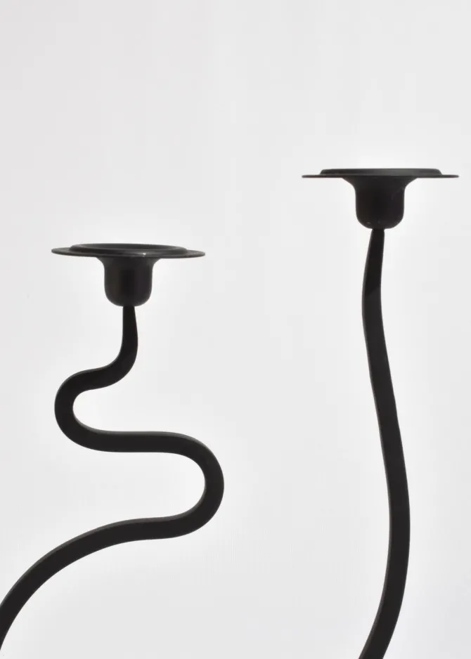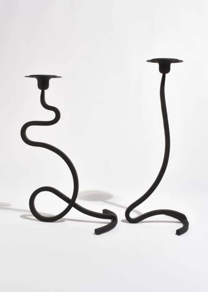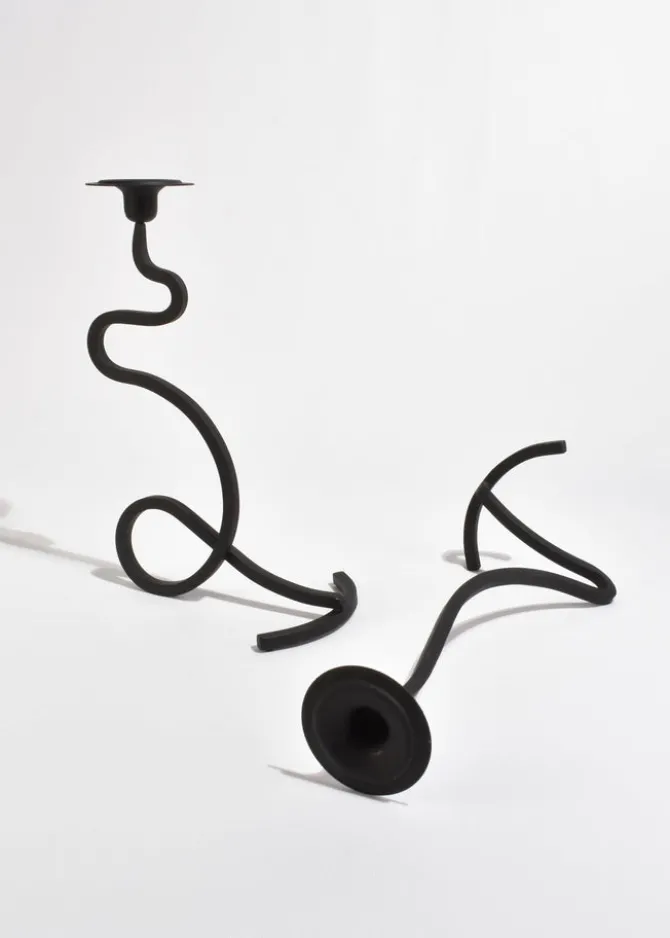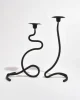 Sculptural iron candleholder set with fluid, looping silhouette and matte black finish. Designed to hold two taper candles at staggered heights, creating a dynamic and balanced form. Each is marked J. Shoja and Jafaresk 1989.