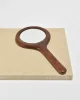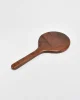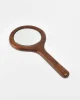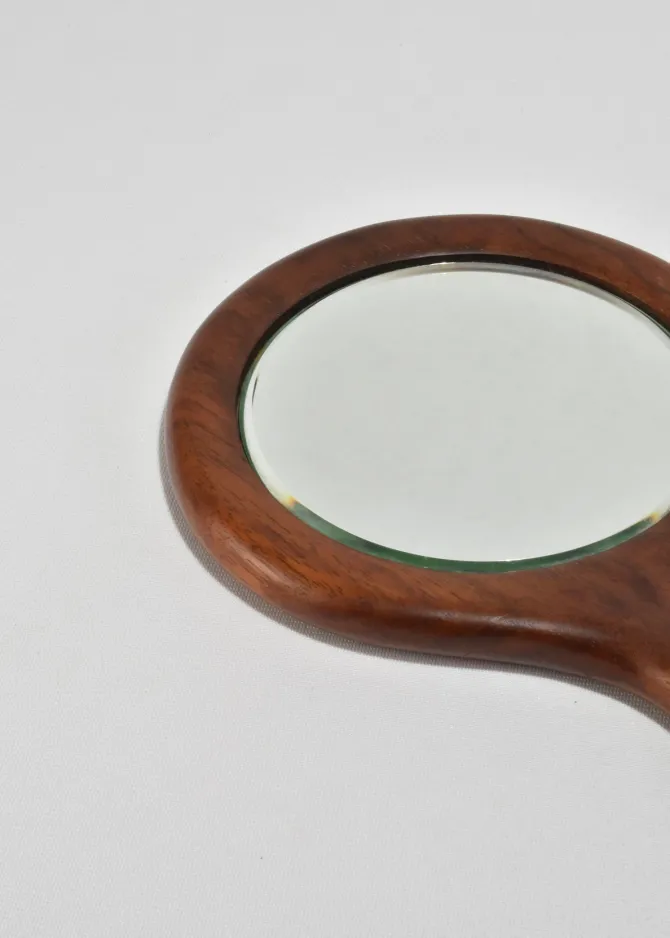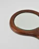 Hand-carved wood hand mirror with a rounded, sculptural frame and elongated handle. Smoothly contoured with visible grain and a substantial, organic feel.