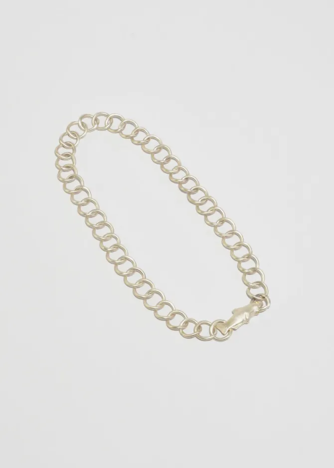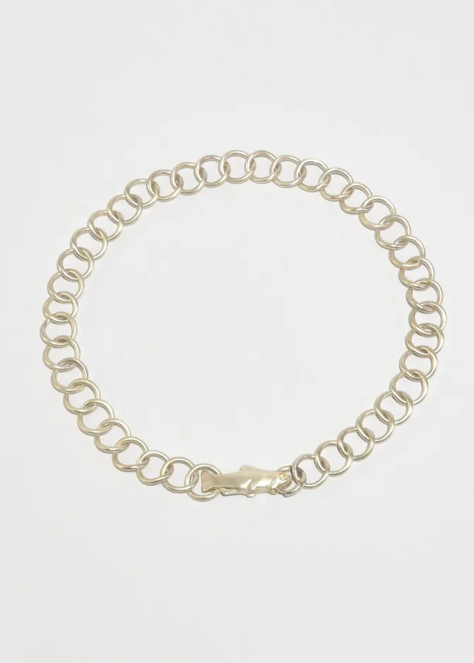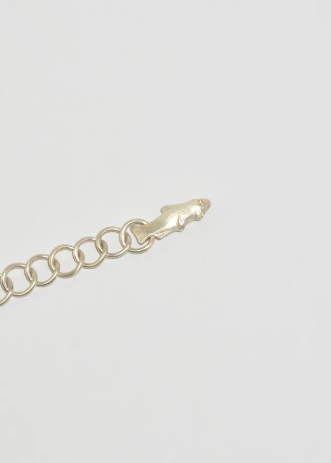 A sterling casted trout on a hand fabricated curb chain, with twinkling yellow sapphire eyes, clasp closure. Handmade in the studio of Lizzie Ames in Brooklyn, NY.